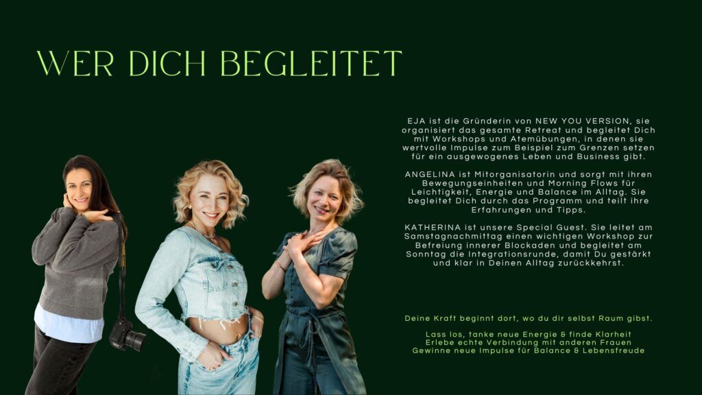 Dieses Retreat bietet dir eine kraftvolle Gelegenheit, dich mit deiner weiblichen Essenz und inneren Stärke zu verbinden. Durch geführte Embodiment-Praktiken und ein besonderes Fotoshooting kannst du deine authentische Präsenz sichtbar machen und tief in deine Kraft eintauchen. Erlebe eine intensive Zeit der Selbstentdeckung, Stärkung und Gemeinschaft mit gleichgesinnten Frauen in einem sicheren und liebevollen Raum.